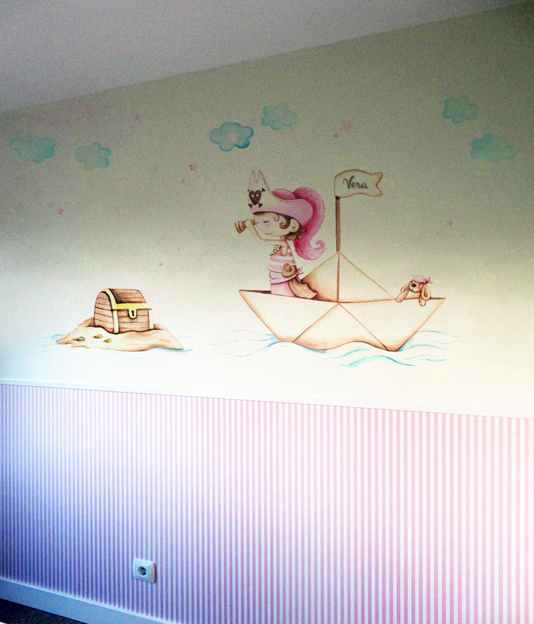 - Vinilo infantil de niña en barco pirata con cofre del tesoro