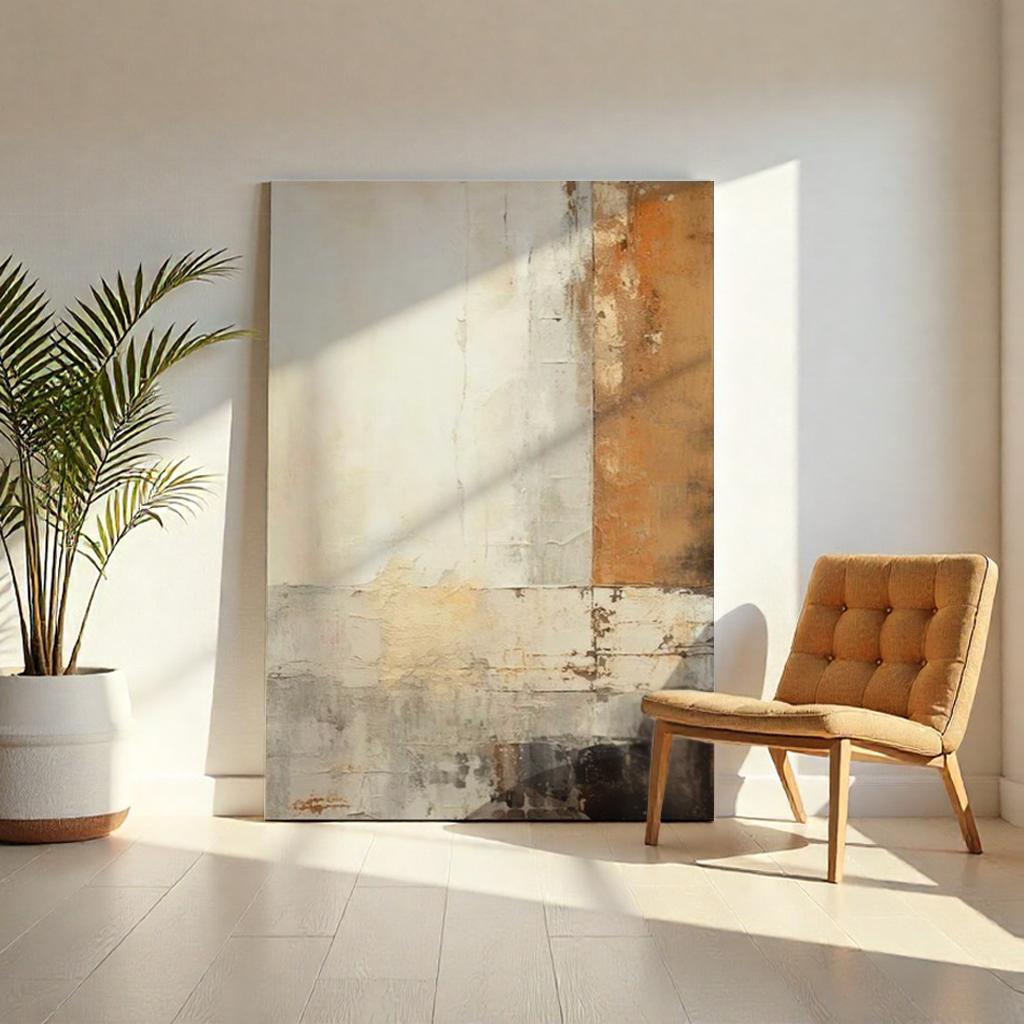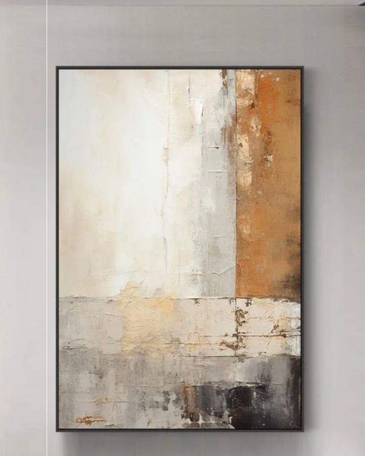 Añade estilo y sofisticación a tu espacio de trabajo con este cuadro abstracto pintado a mano, diseñado para combinar con cualquier ambiente moderno o profesional. Sus tonos neutros cálidos crean una sensación de calma y elegancia, mientras que la textura única de la pintura aporta profundidad y carácter a tus paredes.