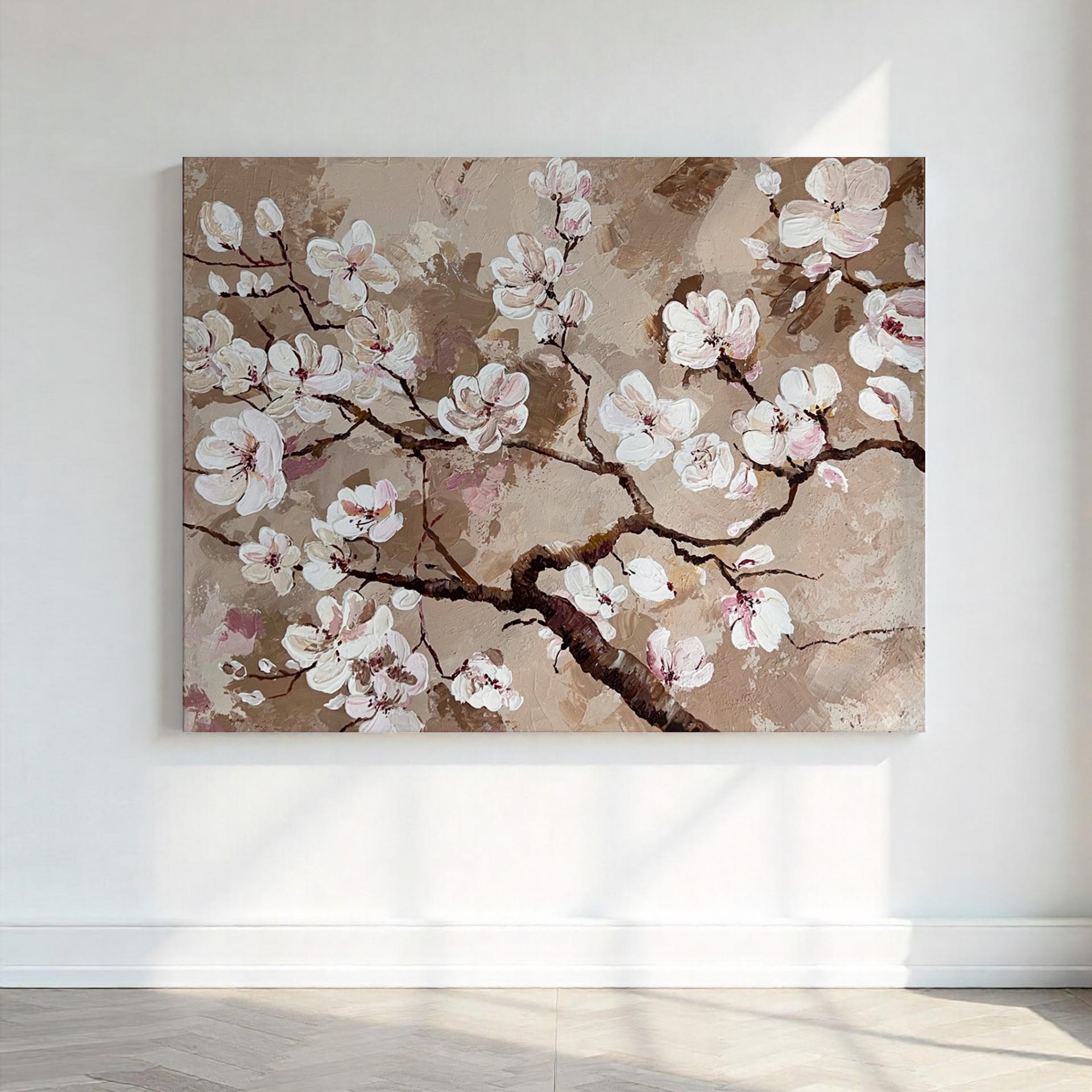 Cuadro decorativo pintado a mano de cerezo en flor con textura en tonos neutros - lienzo de 100x81 cm. – Pintado a Mano - Sin marco