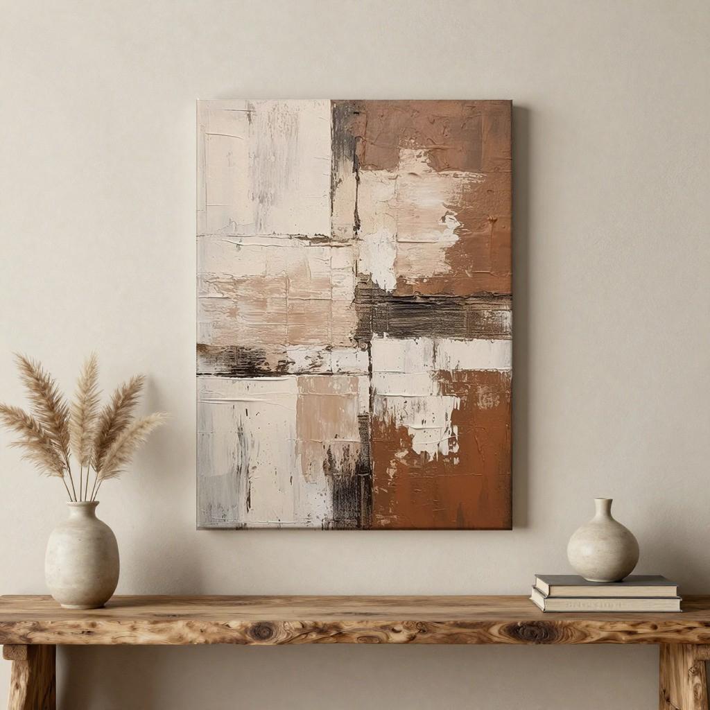 Descubre este cuadro abstracto rústico pintado a mano, una pieza única que aporta carácter y calidez a cualquier espacio. Con textura artesanal y una cuidada combinación de tonos cálidos —ocres, tierras y matices naturales—, esta obra transmite profundidad, movimiento y un estilo orgánico ideal para interiores contemporáneos, rústicos o boho.